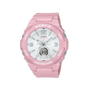 Orologio analogico Baby-G Wriobar multifunzione con display digitale. Interamente in resina rosa con quadrante e dettagli bianchi.